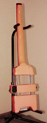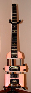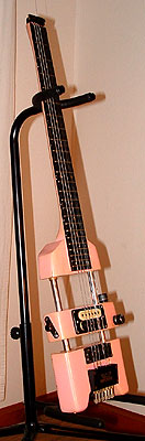 Pink colour aside (not likely a factory finish, but who knows?) this example shows different construction and electronic ideas from the black version above which looks closer to the Rail bass. This is an obvious prototype, and an earlier one by the look of it. The owner describes it like this: